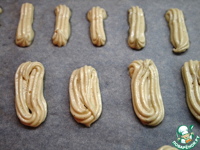 Постелить на противень силиконовый коврик или бумагу для выпечки. Наполнить тестом кондитерский мешок или пластиковый пакет со срезанным уголком и выложить тесто язычками на расстоянии 3-4см один от другого.