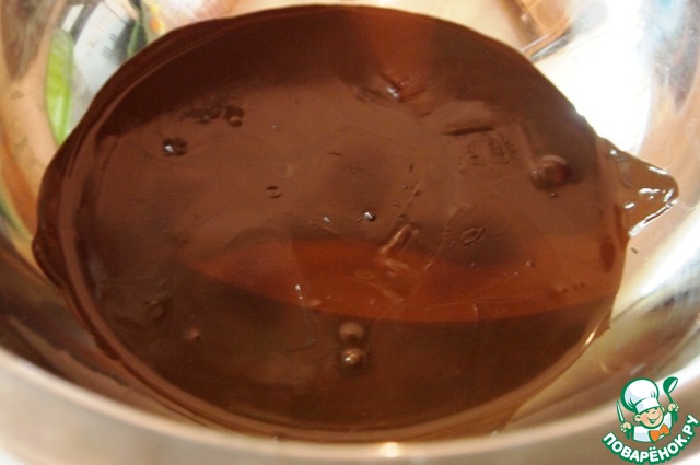 В это время шоколад поломать на кусочки и поставить на водяную баню растапливаться. Если процент какао-масла в шоколаде 72, то он топится очень хорошо и застывает на готовых изделиях очень гладким и блестящим.