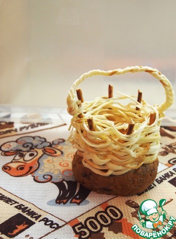 Для праздничной подачи моего подарка я решила попробовать изготовить вот такую корзиночку. Нужно взять не очень мягкую маленькую булочку, чтобы палочки в ней крепче держались. Срезать верхушку, воткнуть палочки в дно и оплетать их расплетенными из сыра-косички нитями.