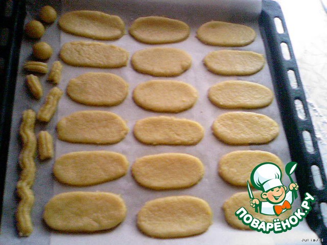 Достаём из холодильника наше песочное тесто. Раскатываем его толщиной 5 мм и вырезаем овалы. Выкладываем овалы на противень.