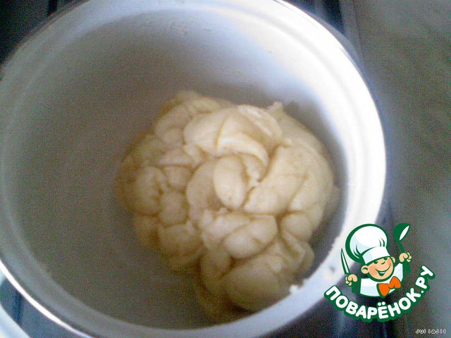 А теперь готовим заварное тесто ("Choux"): в кастрюльку наливаем воду, добавляем сливочное масло и щепотку соли. Ставим на огонь и доводим до кипения. Теперь всыпаем сразу всю муку и перемешиваем блендером. Ставим смесь снова на огонь, пока она не начнёт отставать от стенок и дна кастрюли (у меня это произошло буквально сразу).