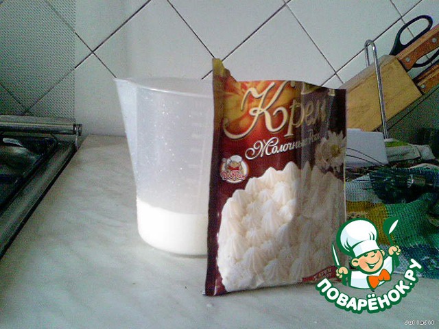 Сейчас можно приготовить крем. В молоко всыпаем смесь из пакетика с кремом и тщательно перемешиваем до получения однородной массы. После - отправляем в холодильник.