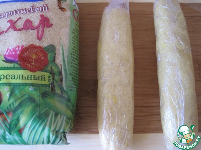 Смешаем имбирь и цедру с первой половиной отложенного теста. Сформируем две колбаски, каждую плотно завернём в пищевую плёнку и уберём в холодильник на 1 час для охлаждения.