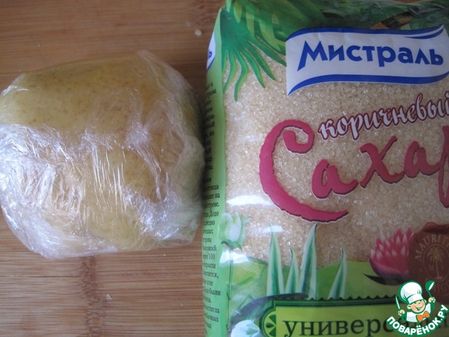 Во вторую часть теста добавим щепотку соли и ванилин (пока ещё тесто в состоянии крошки). Всё перемешаем и сформируем колобок, который плотно завернём в пищевую плёнку и уберём в холодильник на 1 час для охлаждения.