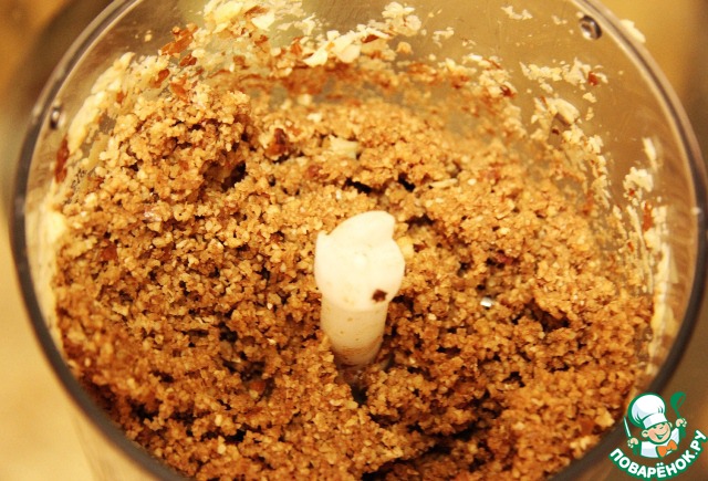 Теперь загружаем миндаль в блендер. Если миндаль не сильно окрасился, можно добавить какао, сбиваем до мелкой крошки.