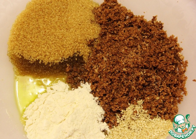 Приготовим тесто. В миску кладем все ингредиенты: кунжут, молотый миндаль, оливковое масло, сахар, дрожжи, муку.