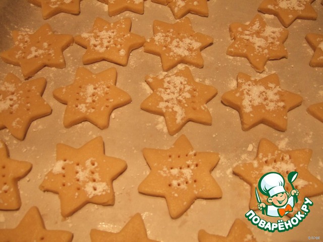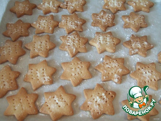 Перекладываем на застеленный бумагой противень, посыпаем сахарной пудрой и натыкиваем вилочкой. Тем временем прогревается духовка до 150гр. (электро, а газовая 130гр). Выпекаем наше печенье около 25 минут.