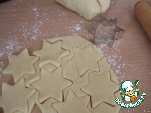 присыпим поверхность мукой, раскатаем пласт 0,5 см. (лучше брать тесто маленькими порциями, а не всё сразу). Теперь вырезаем фигурное печенье.