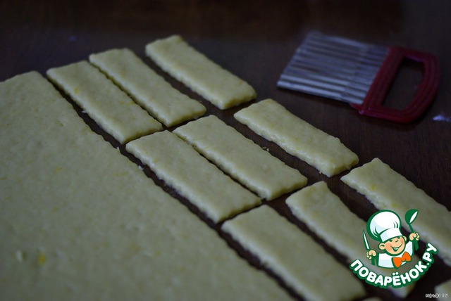 Раскатать в пласт толщиной 3-5 мм, нарезать фигурным ножом на полоски длиной 5 см и шириной 2 см.