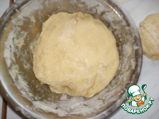 Добавляем, перемешивая муку и вымешиваем мягкое тесто, но чтобы его можно было раскатать и оно не сильно липло к рукам. Ставим на полчасика в холодильник...