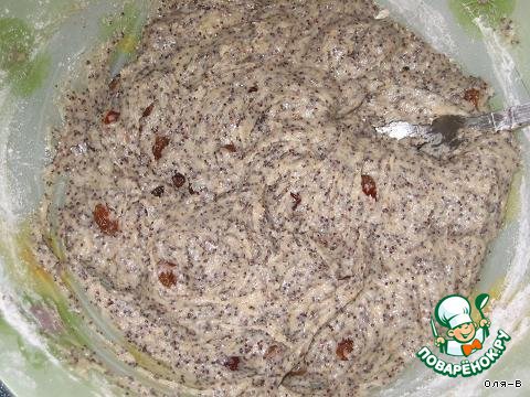 Отдельно в глубокой миске растереть яйцо, сметану, сахар, ваниль, влить растопленный маргарин, добавить протертый мак и всыпать изюм, затем добавить муку, все размешать.