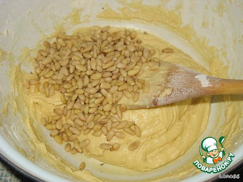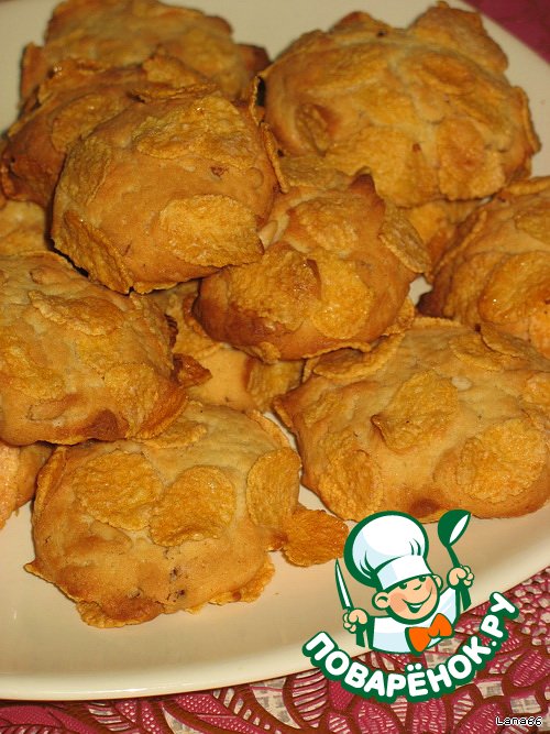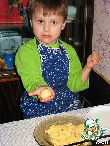 | Сладкое печенье с кедровыми орешками. Отличается от обычного тем, что сверху оно покрыто золотистыми кукурузными хлопьями. От такой добавки печенье становится и вкуснее, и красивее. Мои мальчишки снова в фартуках :) Уж больно понравилось им возиться с тестом, а так же появился интерес в участии конкурса "Silver Line на радость детям" |