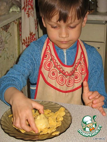 Затем шарик обвалять в кукурузных хлопьях, слегка приминая их к тесту.