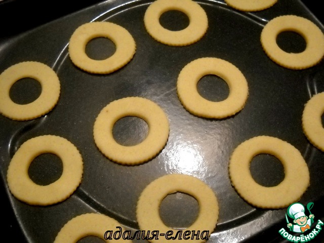 Далее припылить стол мукой, раскатать тесто и круглой формочкой (или любой подходящей) вырезать печенье. Перенести на противень и выпекать около 10 мин. при 180 градусах.