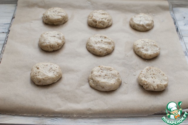 Разогрейте духовку до 180С. Тесто в это время пусть постоит 5 минут в морозилке. На застеленный бумагой противень выкладывайте шарики теста диаметром примерно 5 см. Сформировать шарики можно мокрыми руками или ложкой. Придавите их немного. Оставляйте между печеньями побольше места, в процессе выпечки они очень сильно расплываются.