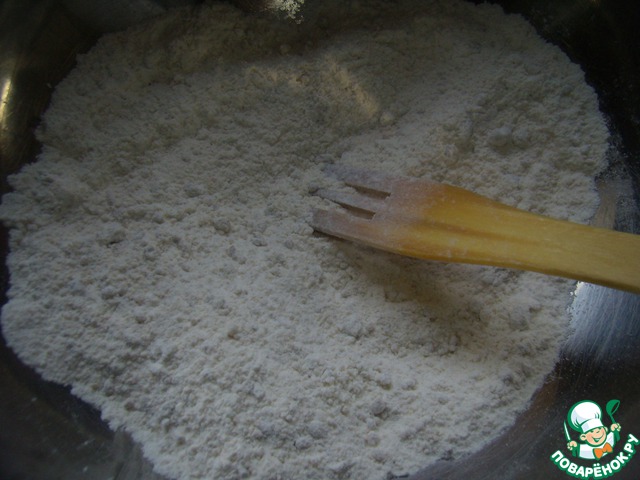 Муку смешать с орехами (подсушенными и перемолотыми в крошку), добавить щепотку соли и крахмал.