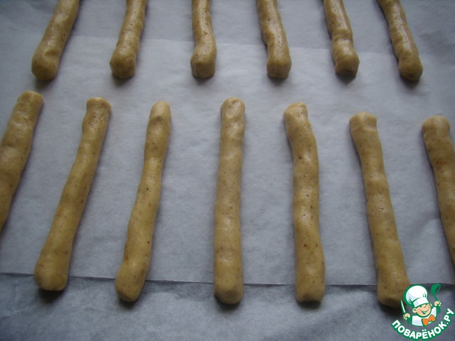 Из шариков скатать палочки и выложить на заранее застеленный пергаментом противень.