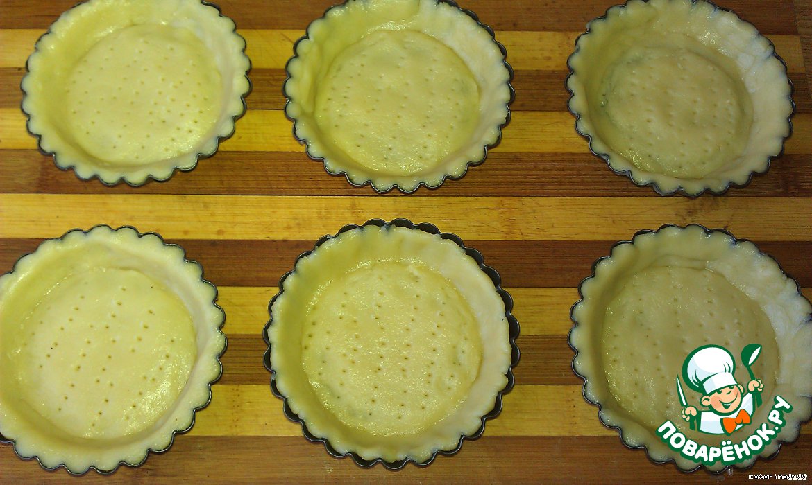 Для теста смешиваем в комбайне маргарин с сахарной пудрой, после добавляем яйца, продолжая вымешивать, постепенно добавляя муку. Вымешиваем до однородной пластичной массы, которая не должна приливать к рукам. Тесто заворачиваем в пищевую плeнку и отправляем в холодильник на 1 час. После тесто разделяем на равные шарики и раскатываем каждый шарик скалкой. Выкладываем тесто в форму и накалываем дно нашей корзинки вилкой. Засыпаем в форму с тестом лущенный горох или фасоль, чтобы тесто не вздулось при выпекании. В разогретую до 200-220 градусов духовку ставим корзинки и выпекаем до готовности около 15-20 минут. Достаeм из духовки формы и даeм остыть. И только тогда удаляем из них горох и вынимаем корзинки из формочек.
