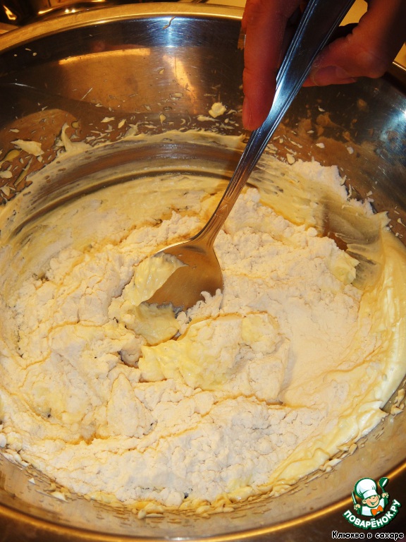 Высыпаем муку к взбитому маслу и перемешиваем до однородной консистенции.
