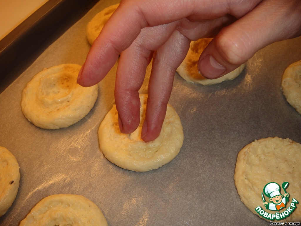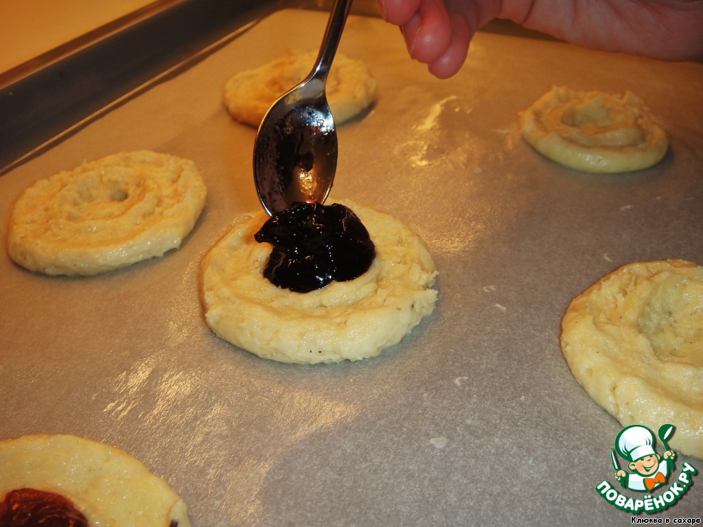 Включаем духовку на разогрев до 180 градусов. Выстилаем противень пекарской бумагой и немного смазываем её сливочным маслом. Достаём тесто из холодильника. Отделяем от него маленькие кусочки (около 15 г каждый), скатываем в шарик и, приплюснув его, делаем кружочки около 5 см. в диаметре.