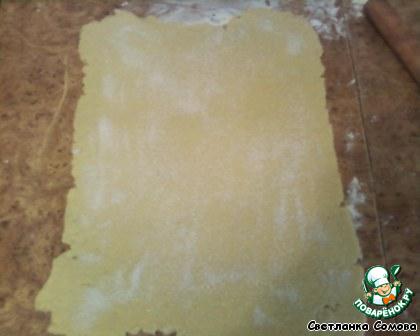 тесто раскатать в пласт толщиной 1 см, сложить его вчетверо, раскатать, снова сложить вчетверо и раскатать.