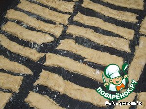 На присыпанной мукой поверхности раскатать тесто и порезать на полосочки.