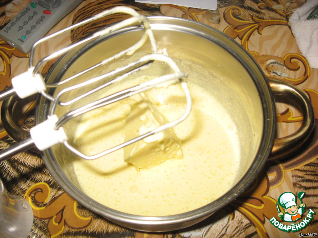 Духовку нагреть до 180 град. Яйцо взбить с сахаром добела, ввести мягкое масло и снова взбить (я делала миксером).