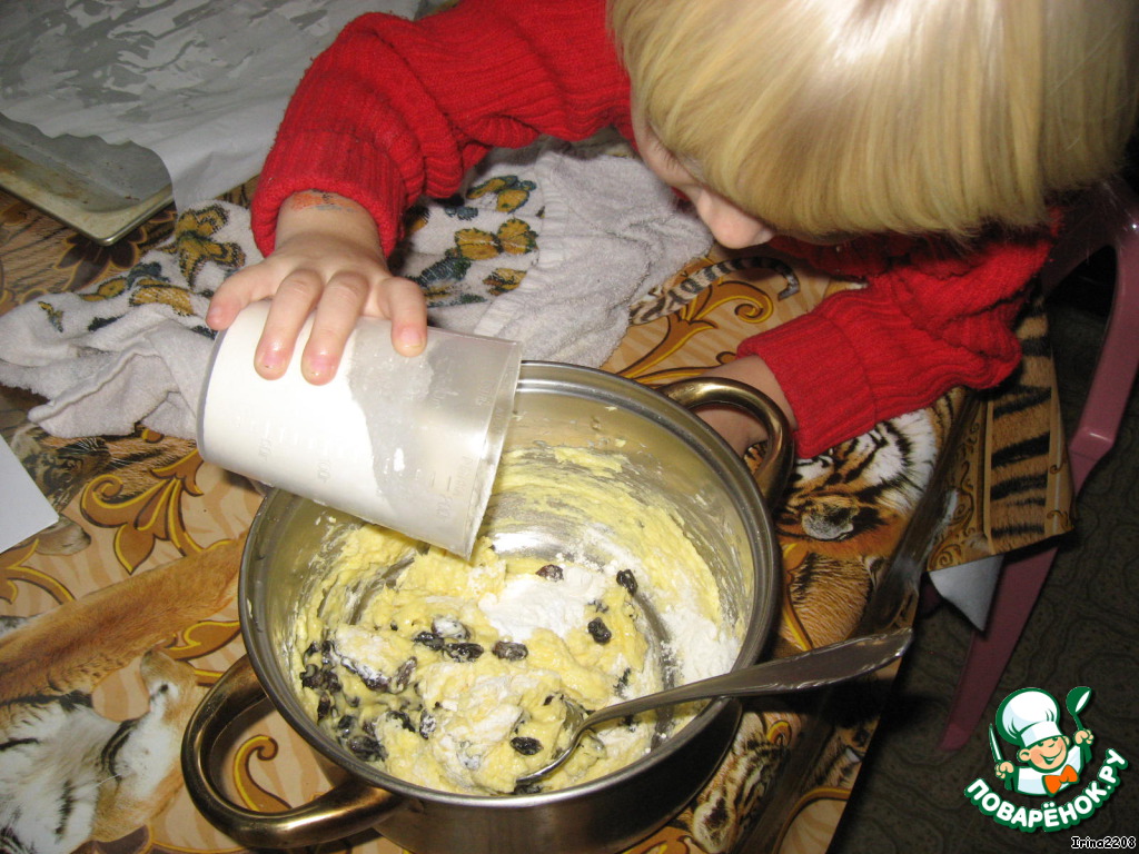 Добавить изюм (если сухой,то распарить в кипятке и высушить, что я и сделала), ввести муку и разрыхлитель по столовой ложке, тщательно перемешивая после каждой дозы. Мне помогала Яна.