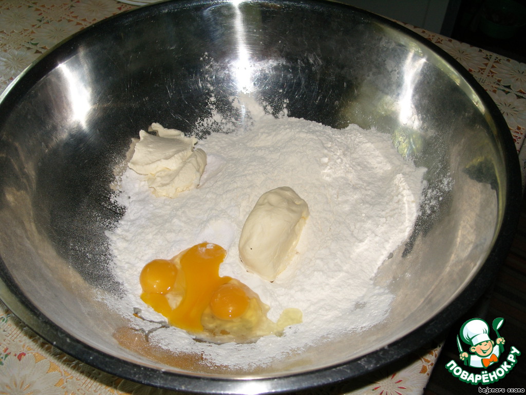 Добавить масло, желтки, яйцо, сметану и замесить тесто.
