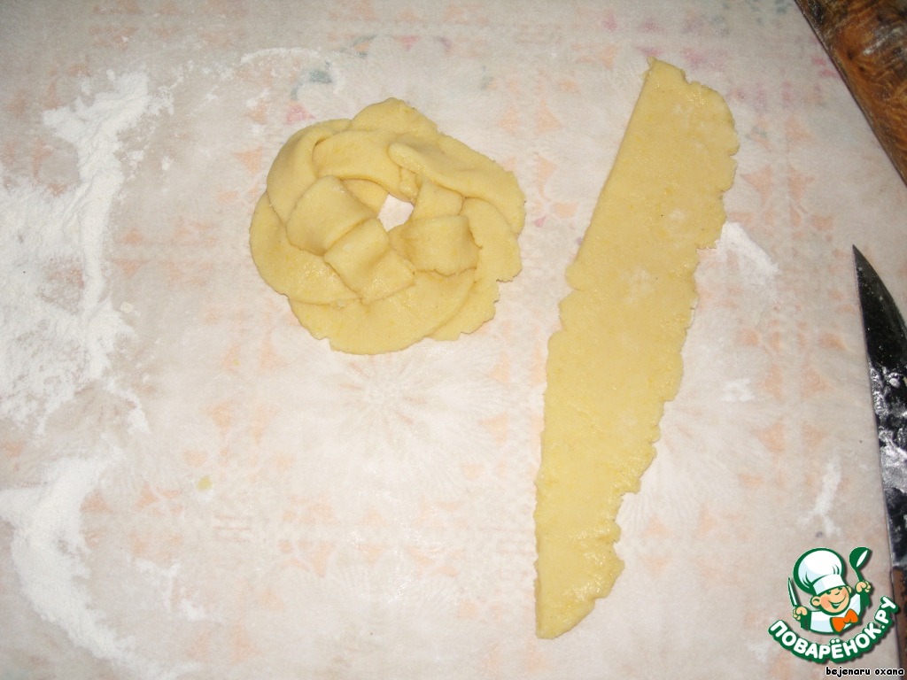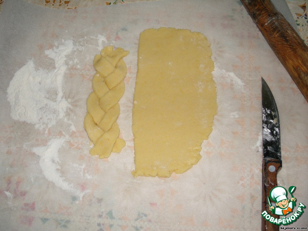 Раскатать тесто в пласт толщиной 0,5 см и нарезать из него полоски и сложить их в виде плетенки и сформировать фигуры в виде круга.