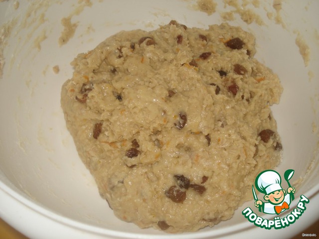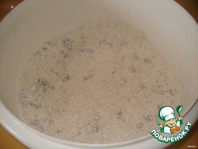 Хлопья слегка перетереть руками, смешать с просеянной мукой, разрыхлителем и изюмом.