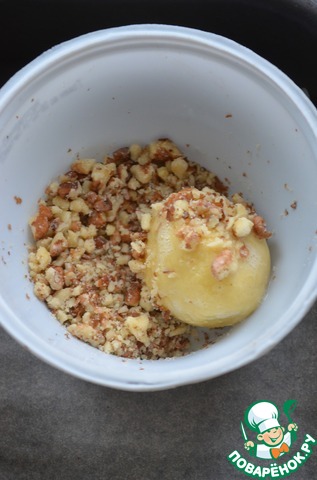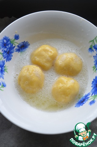 Накатать шариков. Орехи перемолоть, белки взбить вилкой. Обмакнуть шарики в белок