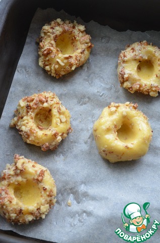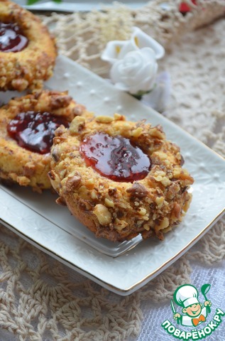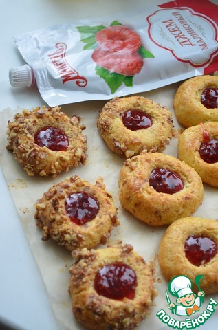 Большим пальцем вдавить серединку, выложить на противень, застеленный пекарской бумагой, выпекать при 170С гр. Через 5 мин. еще раз пальцем вдавить серединку, выпекать 15-20 мин., печенье приобретет золотистый цвет
