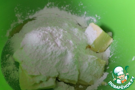 Разотрите сахарную пудру и масло. Добавьте апельсиновую цедру, я вместо цедры добавила специальное эфирное масло апельсина (3 капельки) и хорошо перемешайте.