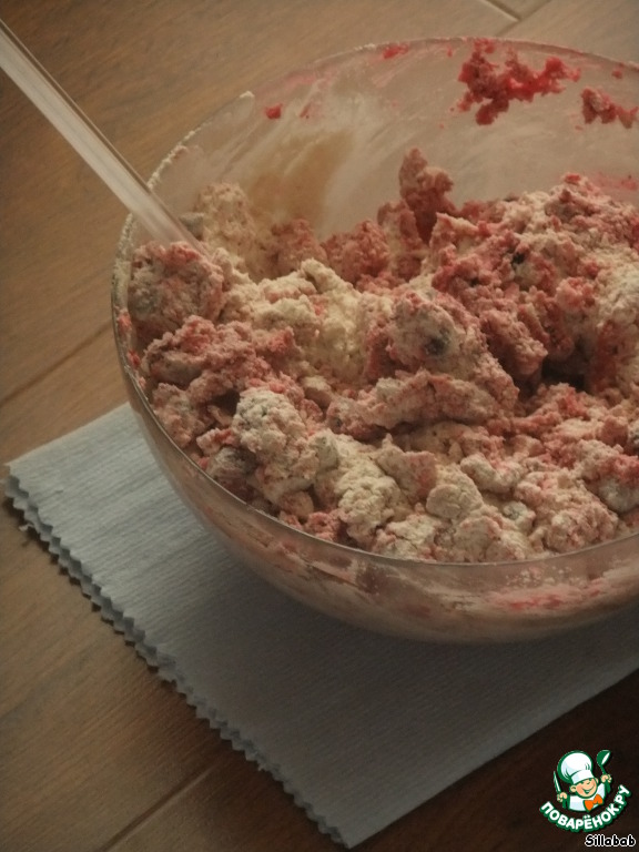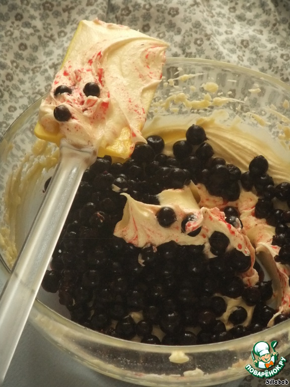 Взбить миксером на малых оборотах, часть ягод лопнет и придаст тесту приятный цвет.