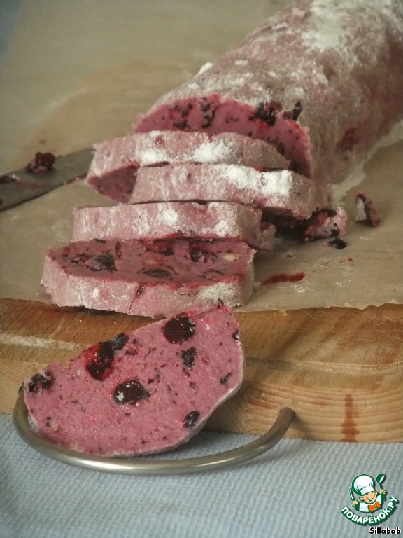 Рабочую поверхность присыпать сахарной пудрой и выложить на нее полученную массу, сформировать колбаску (диаметр на ваше усмотрение). Убрать ее в холодильник минимум на 30 минут, от себя рекомендую на пару часов, так как твердую колбасу легче нарезать и печенье будет выглядеть аккуратнее.