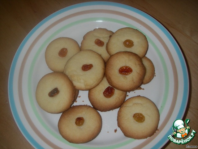 | Песочное тесто сделано по правилу "1 -2 -3 ", описанному на сайте (одна часть сахара, две - масла, три - муки). Но в тесто еще входят 2 желтка и разрыхлитель - получается особенно нежное и рассыпчатое печенье. В каждое печенье воткнем изюминку - красиво и детям очень нравится. |