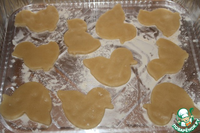 Раскатать тесто примерно до 3 мм толщиной, вырезать любыми формами, поставить в разогретую до 220 градусов печь на 10 мин.