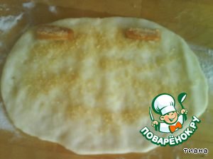 Разминаем руками или скалкой (тонко), посыпаем сахаром и кладем кусочек ириски.