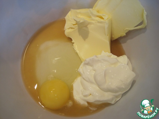 В другой посуде венчиком перемешаем до однородности яйцо, размягчённое масло, коньяк и сметану.
