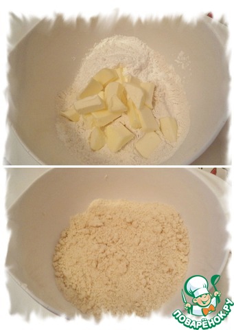 Муку просеять, добавить к ней сахарную пудру, соль и охлаждённое сливочное масло порезанное на кусочки. Измельчить в крошку блендером или комбайном. Я это делала погружным блендером.