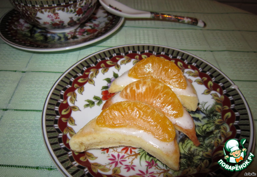 | Нежное, рассыпчатое печенье с белоснежной "шапочкой" сладкой глазури и увенчанное сладкой долькой мандарина - прекрасный повод для чаепития! Источник рецепта - интернет. |