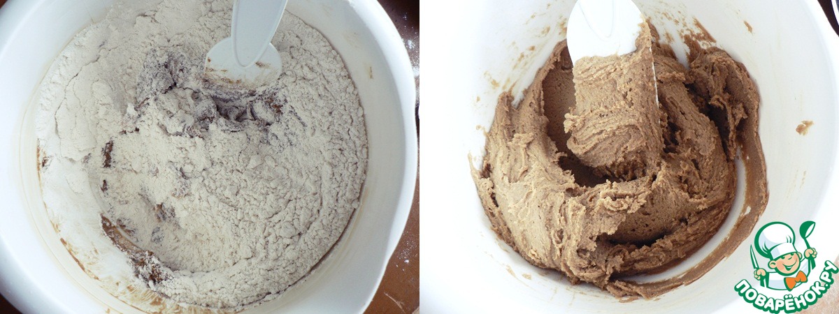 Смешать пшеничную и цельно зерновую муку. Всю сразу добавить в тесто, тщательно перемешивая. Процесс займёт до 5 минут.