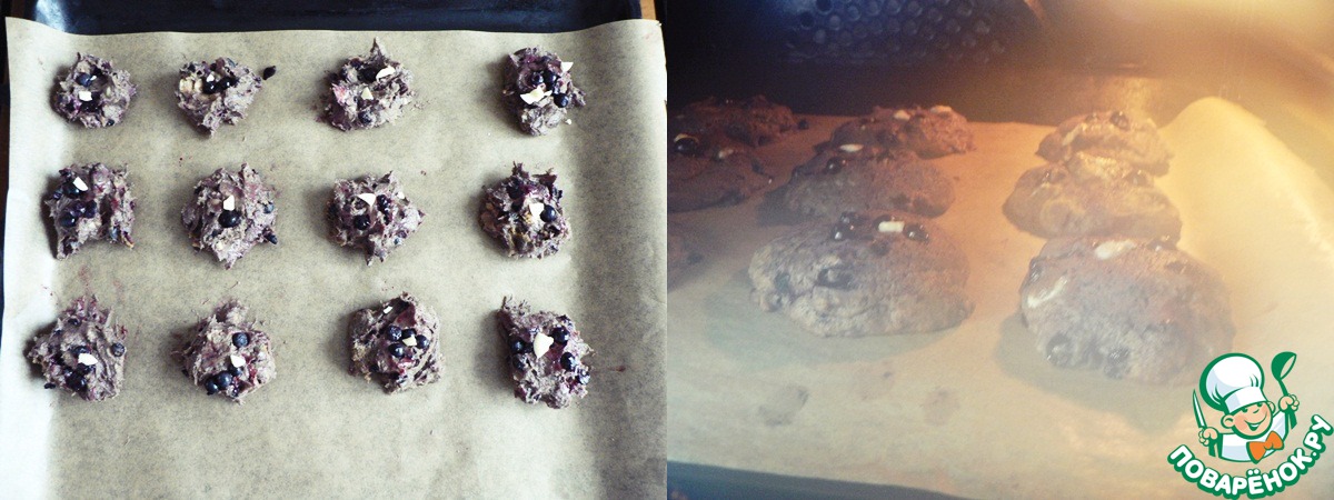 Застелить противень пергаментом, выложить печенье десертной ложкой. Выкладывать печенье нужно на расстояние, так как оно значительно увеличиться в объёмах.
