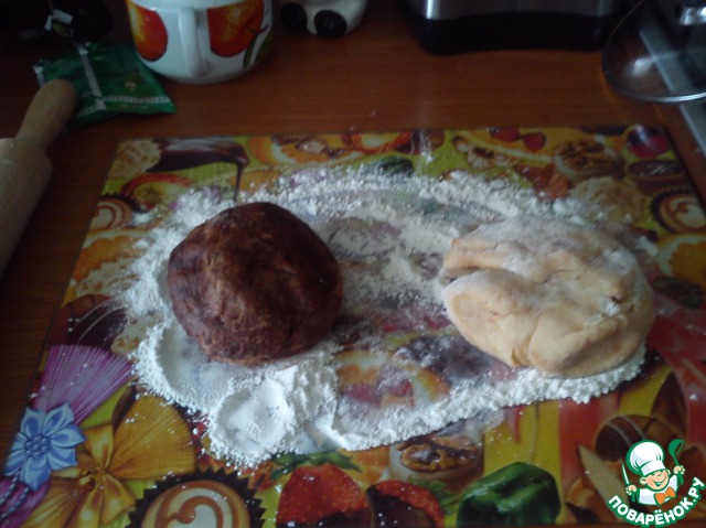 Раскатать в пласт сначалa светлое тесто, затем темное тесто, положить друг на друга слоем и немного придавить скалкой и еще чуть-чуть раскатать, стаканчиком вырезать кружки и в середину каждого круга положить половину чайной ложки повидла.