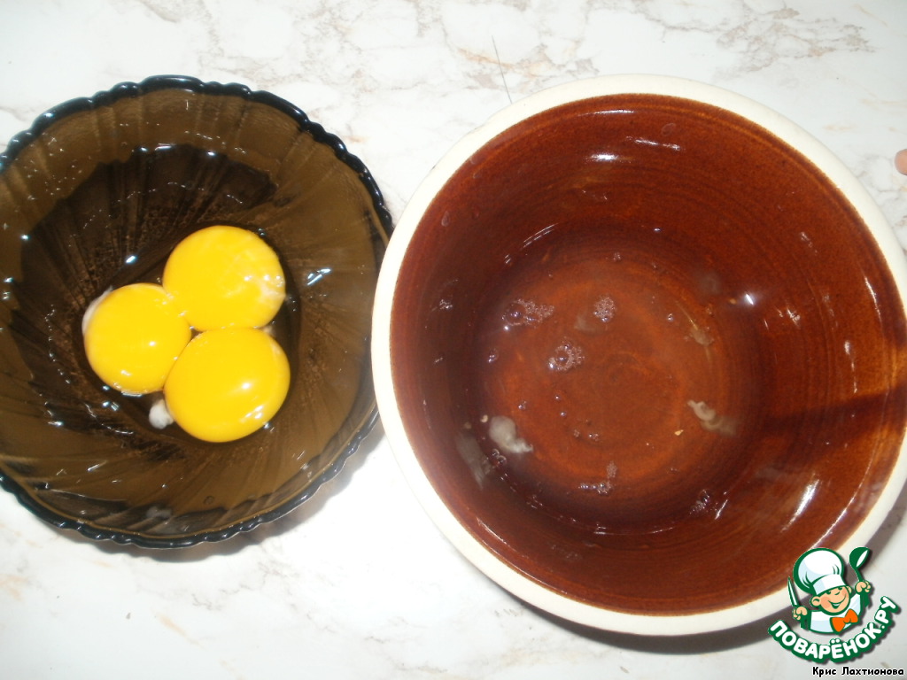 Белки аккуратненько отделить от желтков, так, чтобы в белки не попало ни капельки желтка!