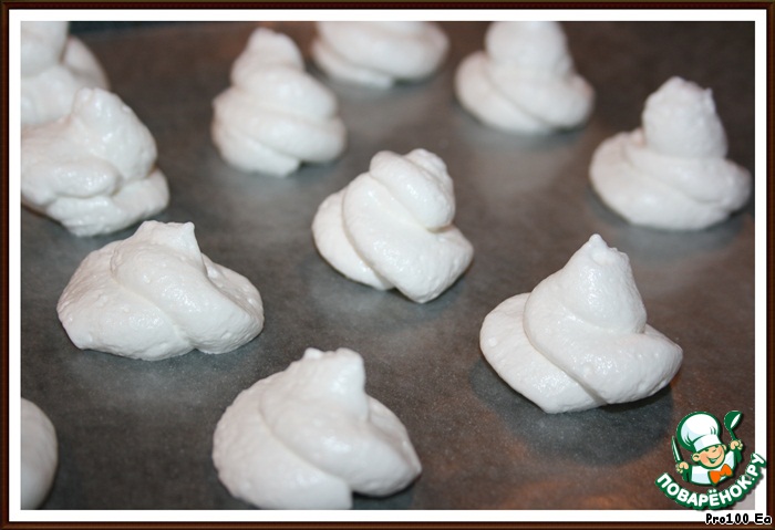 4. На застеленный пищевой бумагой противень при помощи кондитерского мешка или ложки делаем вот такие маленькие безешки. И в духовку на 1 час и 30 минут при 100*С. Дать полностью остыть.