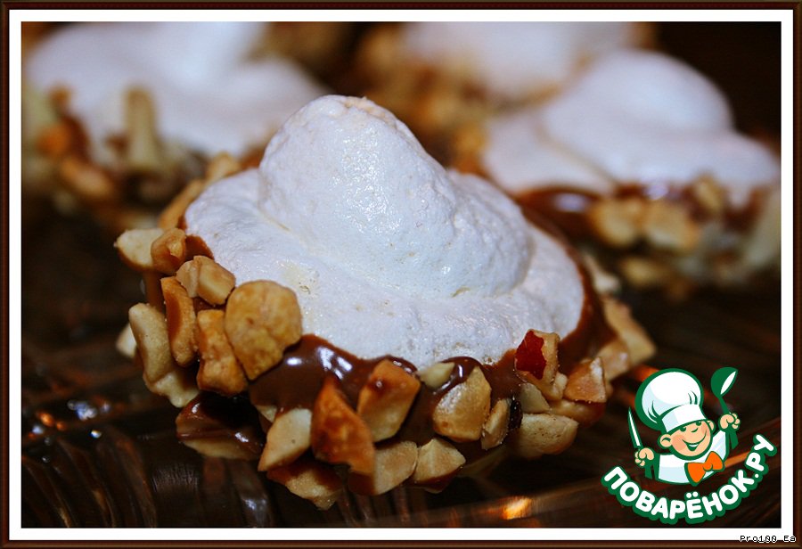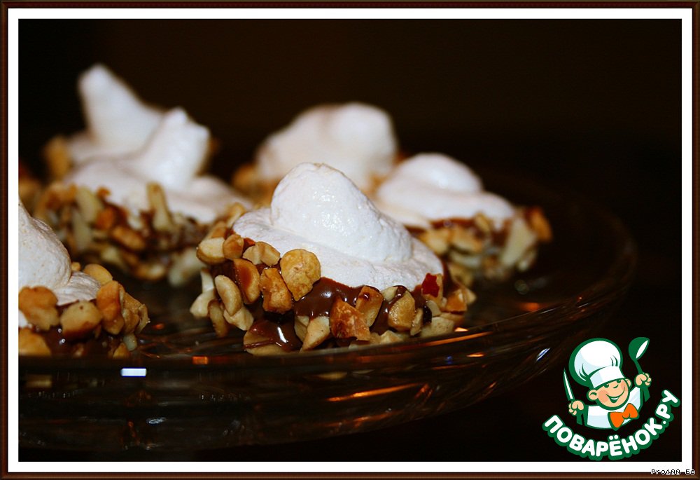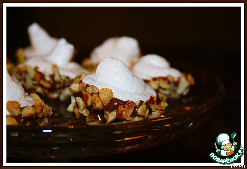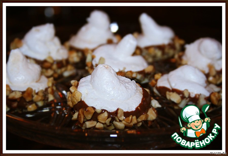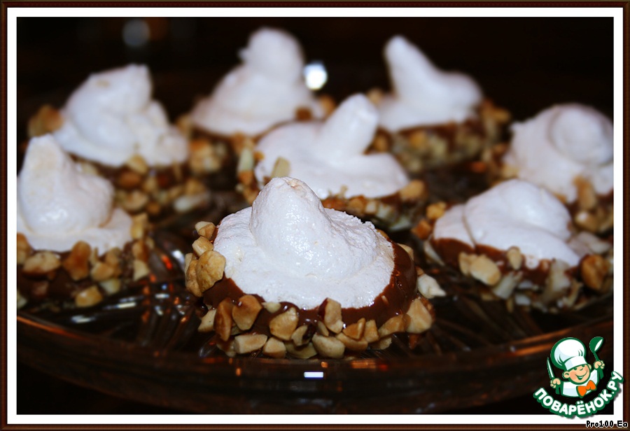 8. Безешку обмакнуть в шоколад, потом в орешки и поставить на застеленный пищевой бумагой противень до застывания шоколада.