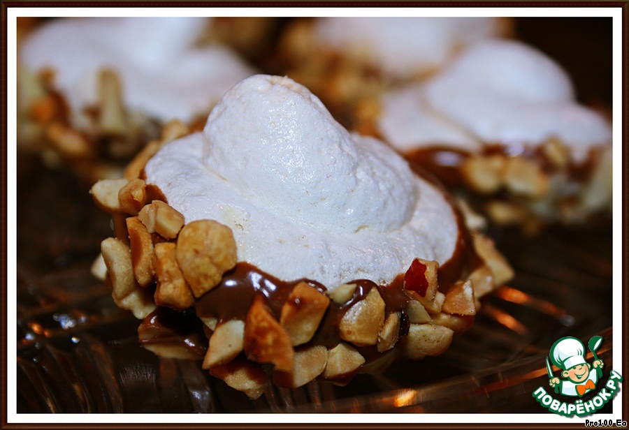 | "Сникерс"... назвала их так, потому что по вкусу они напоминают именно эти конфеты!!! Простое, обычное безе, но миндальный экстракт, шоколад, соленые, жареные орешки - это такое сочетание вкусов, ммммммммммммммммммм. Также они очень красиво смотрятся на праздничном столе. Из одной порции у меня вышло примерно 48 штучек, но это было МАЛО для 5 человек! |