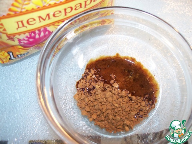 Завариваем кофе несколькими каплями воды. У меня здесь растворимый; если брать молотый, то мелкий помол должен быть. Еще одно важное условие: кофе должен быть свежим.